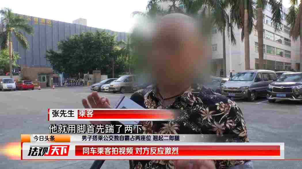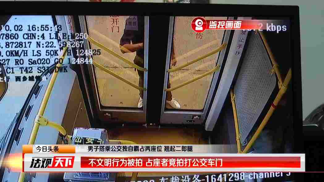 畫面里這位乘客,看起來睡眠質(zhì)量不錯,上了公交車是倒頭就睡,不過,這姿勢可是很不雅,只見這位乘客獨自霸占了兩個座位,一只腳踩在座位上,另外一只腳還不時得靠在椅背上搖晃著,這一幕,可把同車里的張先生給氣壞了。