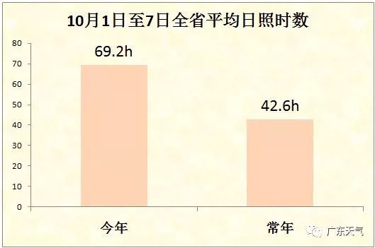 10月1日到7日,全省平均日照時數:今年69.2h,常年42.6h,1951年以來排名第一。