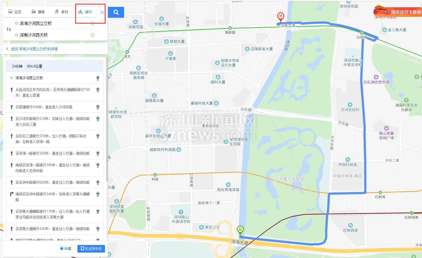 百度地圖中濱海沙河西立交到深南沙河西立交的騎行路線