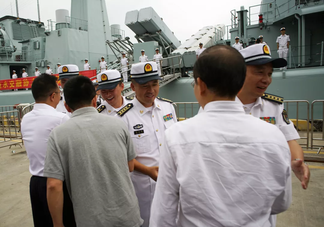 深圳市委副秘書長劉平生,市民政局局長廖遠飛,南山區(qū)委常委、宣傳部部長廖子彬,南山區(qū)委常委、人武部部長彭耀玖,副區(qū)長謝炳文等領導代表市、區(qū)雙擁辦在碼頭上歡送深圳艦。南部戰(zhàn)區(qū)海軍副參謀長李曉巖少將,深圳艦所在某驅(qū)逐艦支隊副政委蔣軍大校,深圳艦艦長黃北奇大校,深圳艦政委陳永強上校等與深圳親人一一握手道別。
