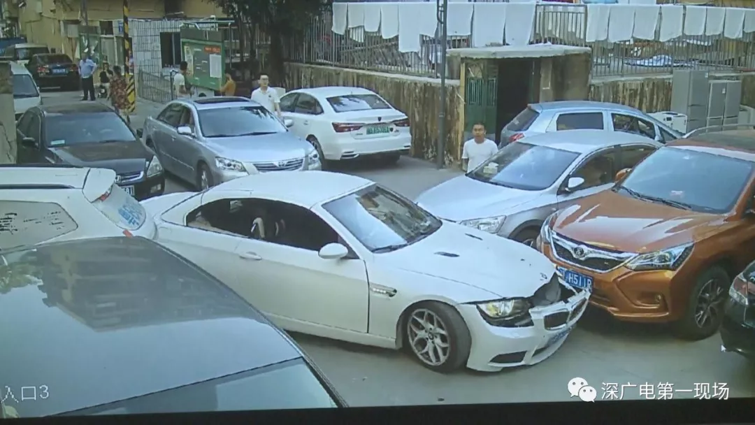 從監(jiān)控畫(huà)面中可以看到,粵E牌白色寶馬小車(chē),在原本就擁擠的停車(chē)路段內(nèi),不停地前進(jìn)倒退,走著奇怪的路線(xiàn),在倒車(chē)時(shí)他接連將停放路旁的車(chē)輛撞了個(gè)遍,隨后便卡在了路中。