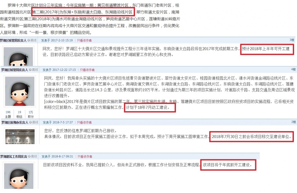 據(jù)了解,為改善居民出行條件,美化居住環(huán)境,羅湖區(qū)于2016年發(fā)布了十大微片區(qū)交通和景觀綜合提升工程計(jì)劃。該計(jì)劃表示全工程將分三年實(shí)施,而太白路-東湖路微片區(qū)屬第二期,應(yīng)于2017年開始動工實(shí)施。但截至2018年11月,該項(xiàng)目仍未動工。從網(wǎng)友發(fā)布的截圖上看,一個(gè)名為“羅湖區(qū)城管局發(fā)言人”的論壇賬號分別于2017年2月、12月以及2018年7月和8月對太白路-東湖路微片區(qū)景觀提升工程延遲實(shí)施的計(jì)劃進(jìn)行了回復(fù)。而相應(yīng)的動工日期也從2018年上半年延遲到了2018年底。