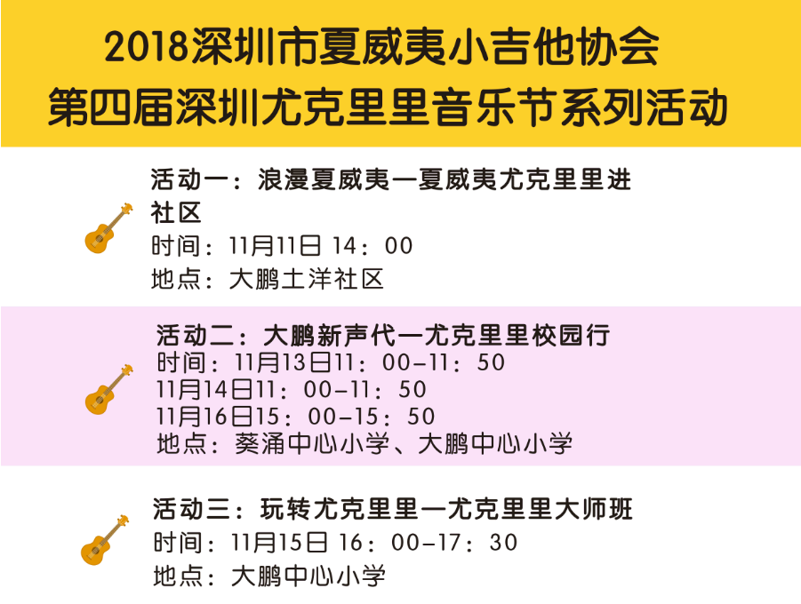 大鵬新區(qū)擁有相對豐富的尤克里里音樂文化底蘊,新區(qū)音樂學(xué)科自2015年已經(jīng)與深圳市夏威夷小吉他協(xié)會開展合作,為全區(qū)音樂教師開展尤克里里師資培訓(xùn)至今,在全國中小學(xué)音樂教師體系率先開展尤克里里課程。本屆大鵬的嘉年華將會為大鵬的學(xué)校,社區(qū)帶來更多的資源,與更多國際尤克里里協(xié)會,知名演奏家交流與互動,讓這種浪漫自由的樂器能在新區(qū)扎根發(fā)芽,開花結(jié)果,將新區(qū)打造成中國的“尤克里里之鄉(xiāng)”。