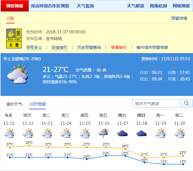 預(yù)計(jì)早晨7-9時(shí),全市多云間陰天;氣溫21 ℃ -23 ℃,相對(duì)濕度75%-90%,輕微偏東風(fēng),能見度3-15公里。深圳市氣象臺(tái)2018年11月11日06:01發(fā)布。