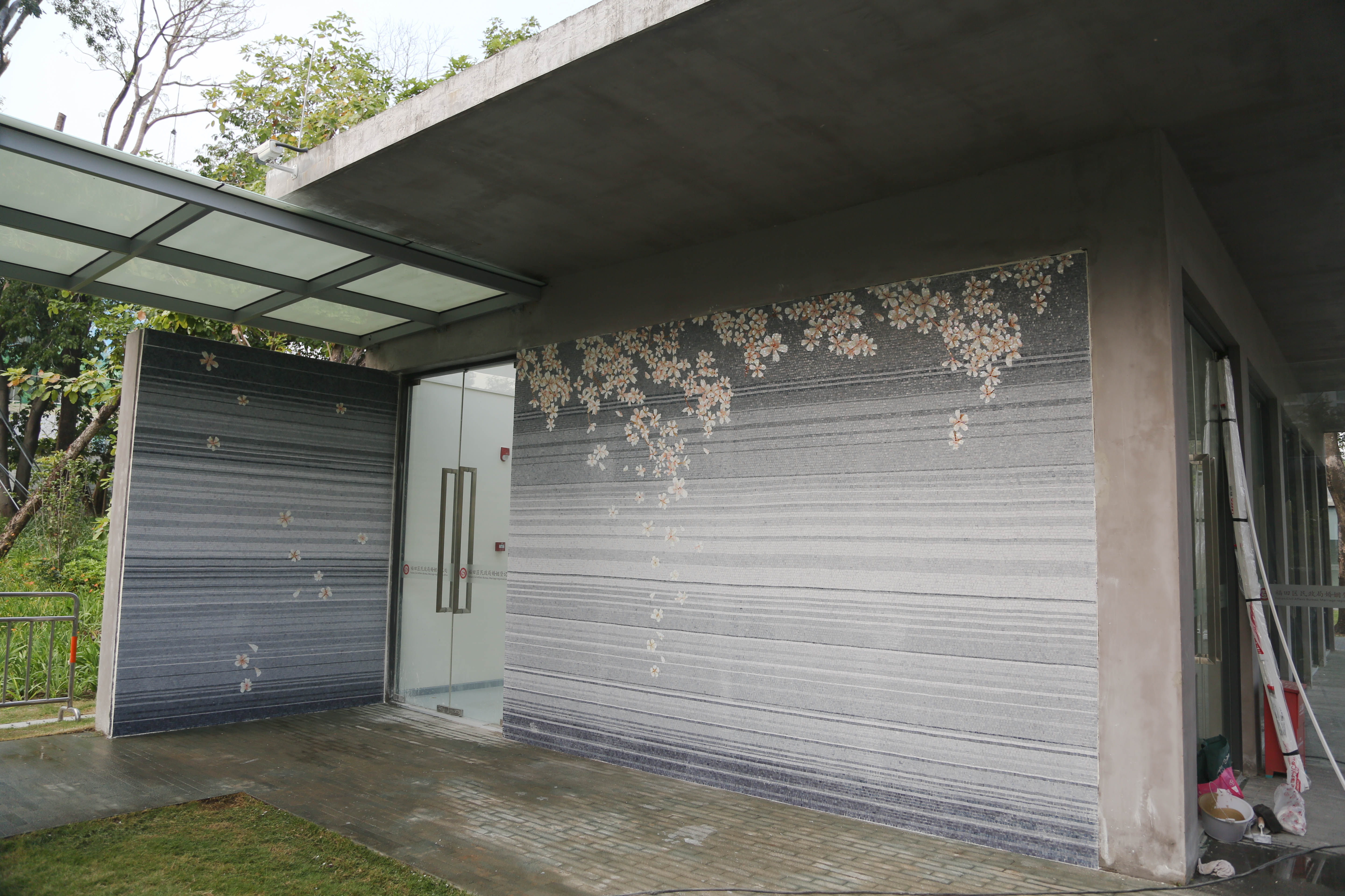 裝點(diǎn)著花瓣的馬賽克瓷磚。