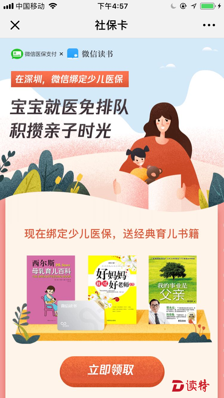 深圳特區(qū)報2018年11月21日訊 作為微信醫(yī)保支付的試點城市,深圳又開通便民新服務,全國內率先開通微信綁定少兒社???,支持少兒醫(yī)保線上支付服務。記者獲悉,11月20日起,父母在微信綁定孩子的少兒社???,就可以用微信上通過醫(yī)保給孩子繳納掛號、就診費用,省去排隊煩惱。此外,20日起,用戶在微信綁定少兒社???,可免費領取微信讀書三本經(jīng)典育兒書籍和3天無限閱讀卡兌換碼。