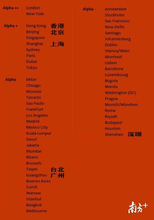 其它的中國城市,香港、北京、上海位于第二檔Alpha+級,分別位于全球3、4、6位,該級共有8個(gè)城市;臺北、廣州位于第三檔Alpha級,分別位于全球26、27位,該級共有23個(gè)城市。