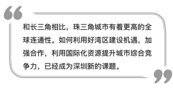一方面,深圳要開展更大范圍、更高水平、更深層次的全球合作,提升在全球網(wǎng)絡(luò)中的地位和能級(jí),增強(qiáng)對(duì)經(jīng)濟(jì)資源要素的配置能力,加深與全球市場(chǎng)的融合程度。另一方面,深圳也應(yīng)從本土優(yōu)勢(shì)和特色出發(fā),進(jìn)一步融入國家開放格局,構(gòu)筑良性的城市-腹地關(guān)系,培育內(nèi)生的經(jīng)濟(jì)、產(chǎn)業(yè)、設(shè)施、資源等支撐體系,通過區(qū)域協(xié)同發(fā)展,增強(qiáng)全球競(jìng)爭力。