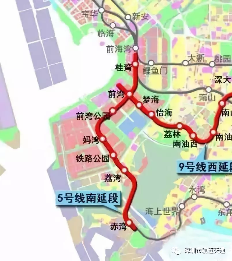 作為三期二階段建設(shè)工程的重要組成部分,地鐵5號線工程建設(shè)南延線南起赤灣站,北至既有5號線起點(diǎn)前海灣站南端,線路全長7.65公里;9號線西延線東起9號線紅樹灣站,由深圳灣總部基地片區(qū)至前海深港合作區(qū),全長約為10.79公里,兩條線均采用地下敷設(shè)方式。