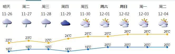 25日多云轉陰天,傍晚前后有零星小雨,早晚清涼,19-24℃;26-28日天空云量較多,間中有小雨,雨時能見度稍低;29日起多云,可見陽光。近期干燥少雨,降雨來臨前仍需做好防火安全管理。