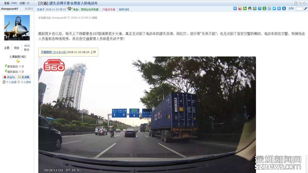 深圳新聞網(wǎng)11月28日訊(記者 劉婷)“電動(dòng)車闖紅燈、逆行、搶道等‘無(wú)所不能'。”近日,深圳論壇網(wǎng)友“zhongyuan87”發(fā)帖吐槽電動(dòng)車在107國(guó)道、西鄉(xiāng)大道無(wú)視交通規(guī)則肆意駕駛,擾亂正常秩序。(網(wǎng)帖:https://szbbs.sznews.com/thread-3824524-1-1.html)