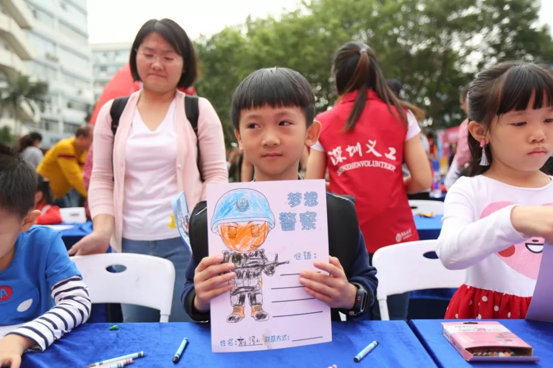最具童年味道和勃勃生機,大人和小孩現(xiàn)場涂鴉,寫出對警察想說的話,也可以在畫架畫板上畫出自己心目中的警察,在孩子心中種下警察的種子,滿滿的寄語,是對福田警察的祝福和期待,這也是警察蜀黍肩膀上沉甸甸的責任和勇往直前的力量!