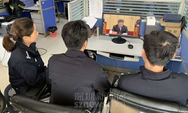皇崗邊檢站民警在辦公室觀看慶祝改革開放40周年大會直播實況