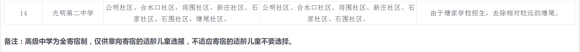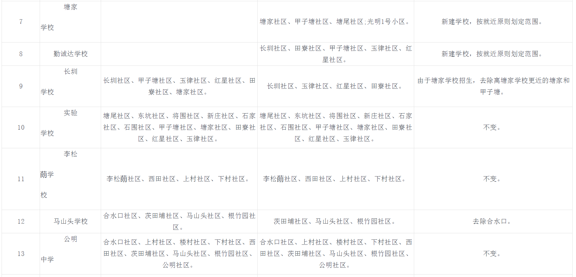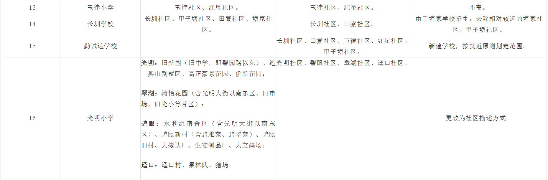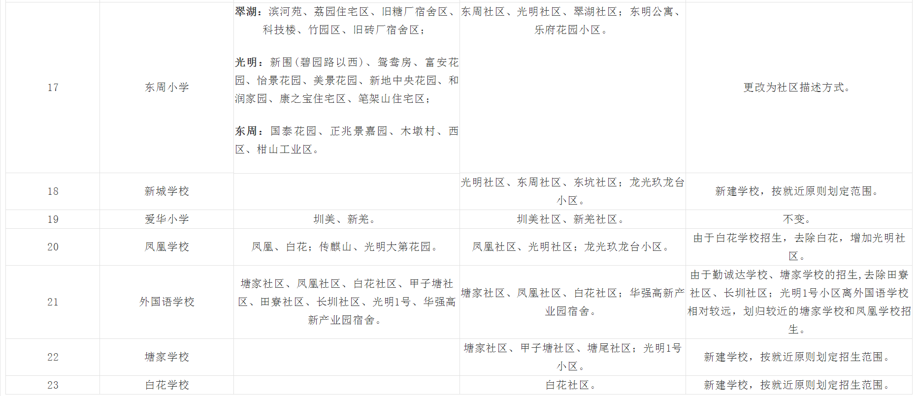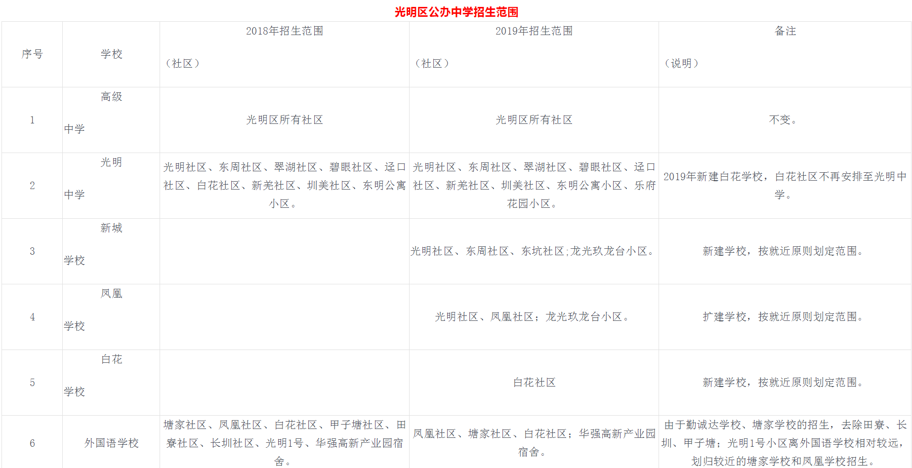 據(jù)悉,2019年光明區(qū)招生原則是原有學(xué)校招生范圍盡量保持不變,新增學(xué)校招生范圍根據(jù)招生規(guī)模、生源情況等按就近原則劃定。由于增加了勤誠(chéng)達(dá)學(xué)校、信宏城小學(xué)、新城學(xué)校、塘家學(xué)校、白花學(xué)校等5所新建學(xué)校,鳳凰學(xué)校擴(kuò)建項(xiàng)目也已完成,因此,招生片區(qū)擬做調(diào)整為:白花社區(qū)不再安排至光明中學(xué);光明外國(guó)語(yǔ)學(xué)校招生去除田寮、長(zhǎng)圳、甲子塘片區(qū);光明1號(hào)小區(qū)劃歸較近的塘家學(xué)校和鳳凰學(xué)校招生;馬山頭學(xué)校招生去除合水口片區(qū);光明第二中學(xué)招生去除相對(duì)較遠(yuǎn)的塘尾片區(qū)。公明二小、下村小學(xué)招生去除相對(duì)較遠(yuǎn)的公明社區(qū);長(zhǎng)圳學(xué)校招生去除相對(duì)較遠(yuǎn)的塘家社區(qū)、甲子塘社區(qū)。鳳凰學(xué)校招生去除白花,增加光明社區(qū)。