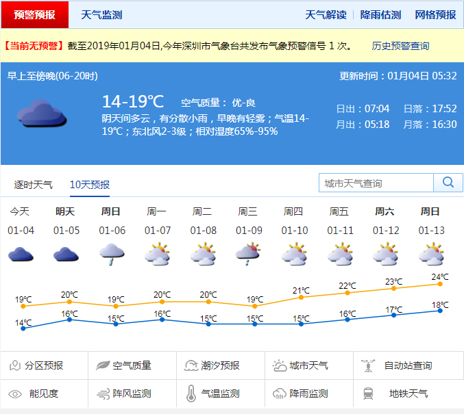 深圳市氣象局預(yù)計,今日氣溫14-18℃;5日下午到9日受弱冷空氣影響,氣溫小幅波動,早晚有輕霧,間中有小雨,部分時間可見陽光。