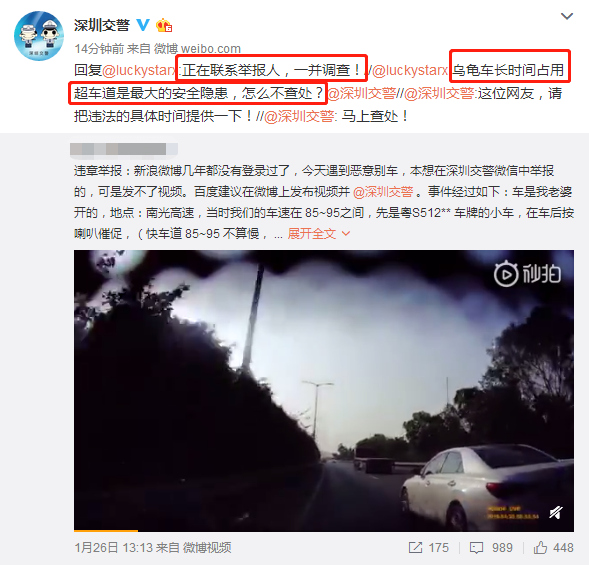 1月28日下午5點(diǎn),深圳交警在微博上也給網(wǎng)友作出回復(fù),對(duì)于長(zhǎng)時(shí)間龜速占用超車(chē)道的行為也將一并調(diào)查。