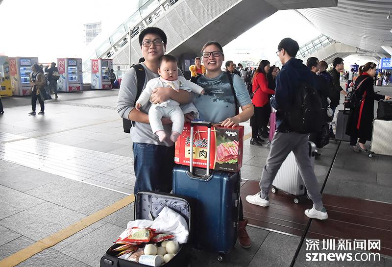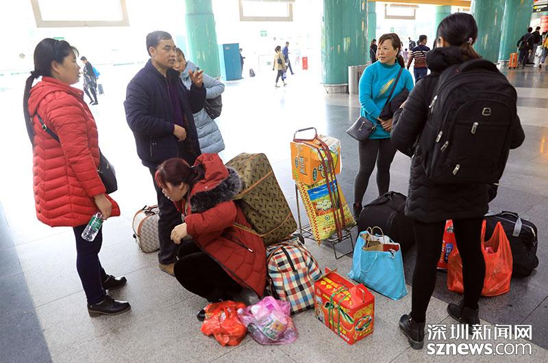 不少旅客攜帶當地水果以及家鄉(xiāng)特產返回深圳,圖中這一家人下車后整理行李