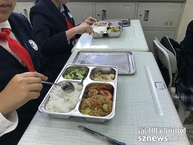 18日上午12點(diǎn)下課鈴聲一過,深圳市福田外國(guó)語(yǔ)學(xué)校南校區(qū)(以下簡(jiǎn)稱”福外南校區(qū)“)的同學(xué)陸續(xù)走出學(xué)校,留在校內(nèi)午餐午托的同學(xué)則安靜的坐在位置上,等待當(dāng)日值班的同學(xué)將準(zhǔn)備好的餐盒分發(fā)到每個(gè)同學(xué)桌上。記者了解到,福外南校區(qū)是2018年秋季新開辦的公辦學(xué)校,從上學(xué)期飯?zhí)媒ê煤?,學(xué)校就組織了飯?zhí)媒?jīng)營(yíng)方和家長(zhǎng)代表就供餐價(jià)格、樣式、品質(zhì)等展開廣泛而深入的討論、協(xié)商。最終確定學(xué)生的膳食為20元,包含三葷一素,提供湯、水果及點(diǎn)心,不僅搭配得當(dāng),更注重營(yíng)養(yǎng)均衡。