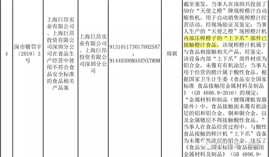 深廣電第一現(xiàn)場(chǎng)2019年2月19日訊 18日我們報(bào)道了,“天使之橙”現(xiàn)榨橙汁自動(dòng)販?zhǔn)蹤C(jī),其生產(chǎn)的現(xiàn)榨橙汁機(jī),內(nèi)部壓榨橙子的鋁合金“上下爪”部件,已接觸橙汁食品。根據(jù)《食品接觸用金屬材料及制品》相關(guān)標(biāo)準(zhǔn),其涉嫌違反《食品安全法》,被深圳市市場(chǎng)稽查局開(kāi)出巨額罰單,沒(méi)收其違法所得1199070元。
