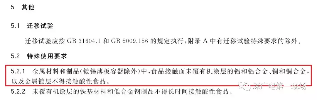 根據(jù)《食品安全國(guó)家標(biāo)準(zhǔn)食品接觸用金屬材料及制品》(GB4806.9-2016)規(guī)定,“金屬材料和制品(鍍錫薄板容器除外)中,食品接觸面未覆有機(jī)涂層的鋁和鋁合金、銅和銅合金,以及金屬鍍層不得接觸酸性食品。”