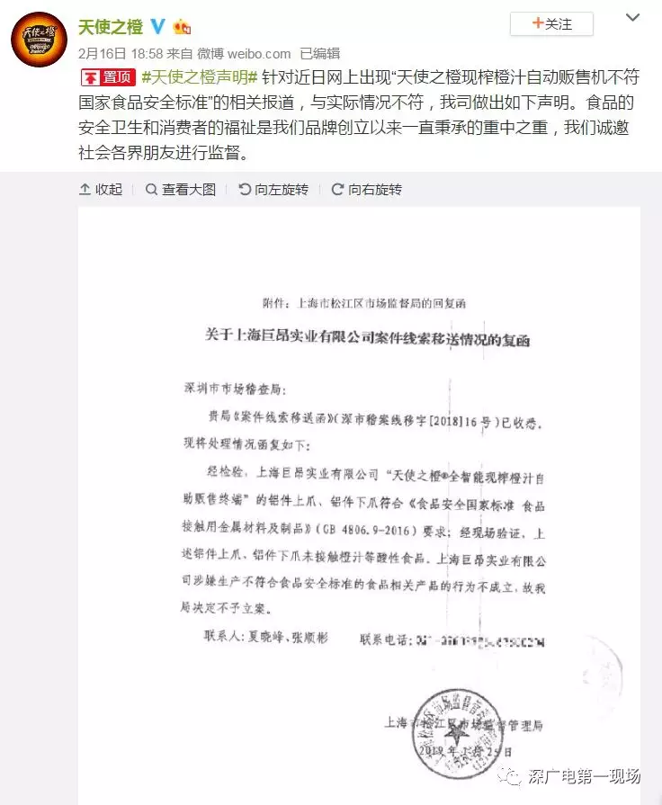 2月16日,“天使之橙”官方發(fā)表聲明,稱(chēng)上海市松江區(qū)市場(chǎng)監(jiān)管局經(jīng)過(guò)現(xiàn)場(chǎng)檢查,并送第三方檢測(cè)機(jī)構(gòu)檢測(cè),認(rèn)為“上下爪”并不會(huì)接觸橙汁等酸性食品,巨昂方面涉嫌違反《食品安全法》的相關(guān)行為不成立,該局不予立案。