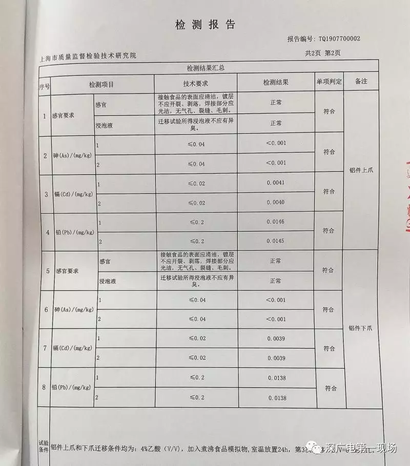 在現(xiàn)場(chǎng),松江區(qū)市場(chǎng)監(jiān)管局還向記者出示了一份該局抽樣后委托上海市質(zhì)檢院進(jìn)行檢測(cè)的檢測(cè)報(bào)告,檢測(cè)對(duì)象是“天使之橙”現(xiàn)榨橙汁機(jī)的上下爪,檢測(cè)依據(jù)就是上述的我國(guó)國(guó)家標(biāo)準(zhǔn)《食品接觸用金屬材料及制品》。經(jīng)檢測(cè),相關(guān)部件的檢測(cè)項(xiàng)目均符合上述標(biāo)準(zhǔn)。