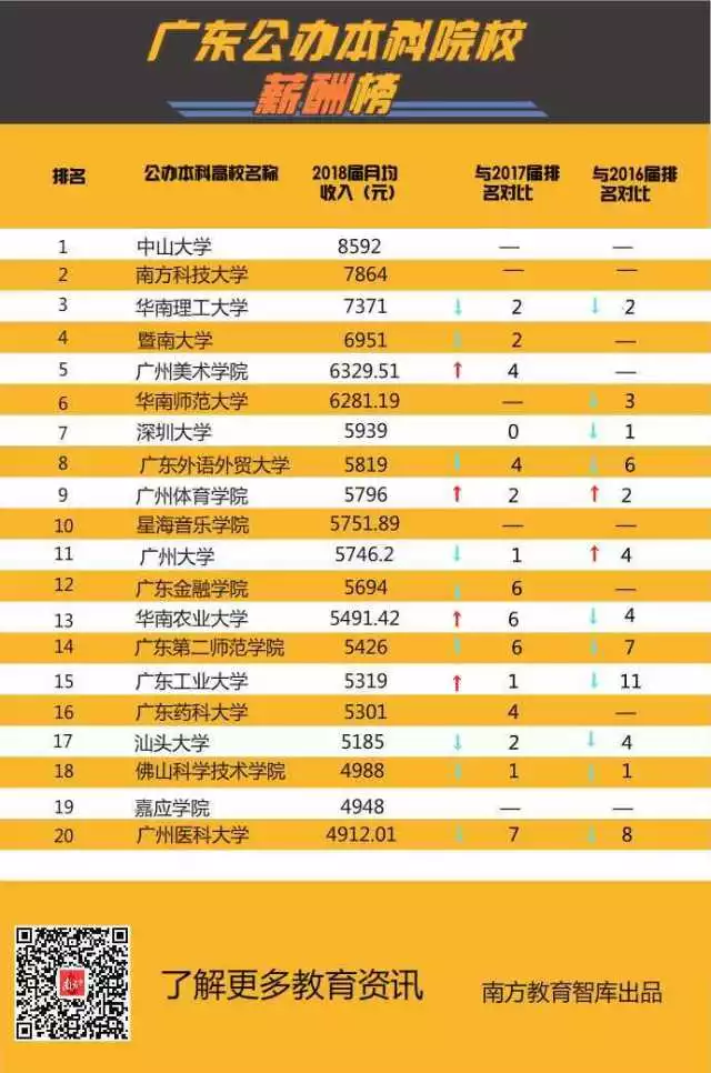▲廣東公辦本科高校薪酬20強,中大、南科大、華工位列前3位。