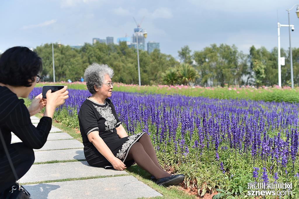 鼠尾草花海前,市民坐下與紫色花海合影留念