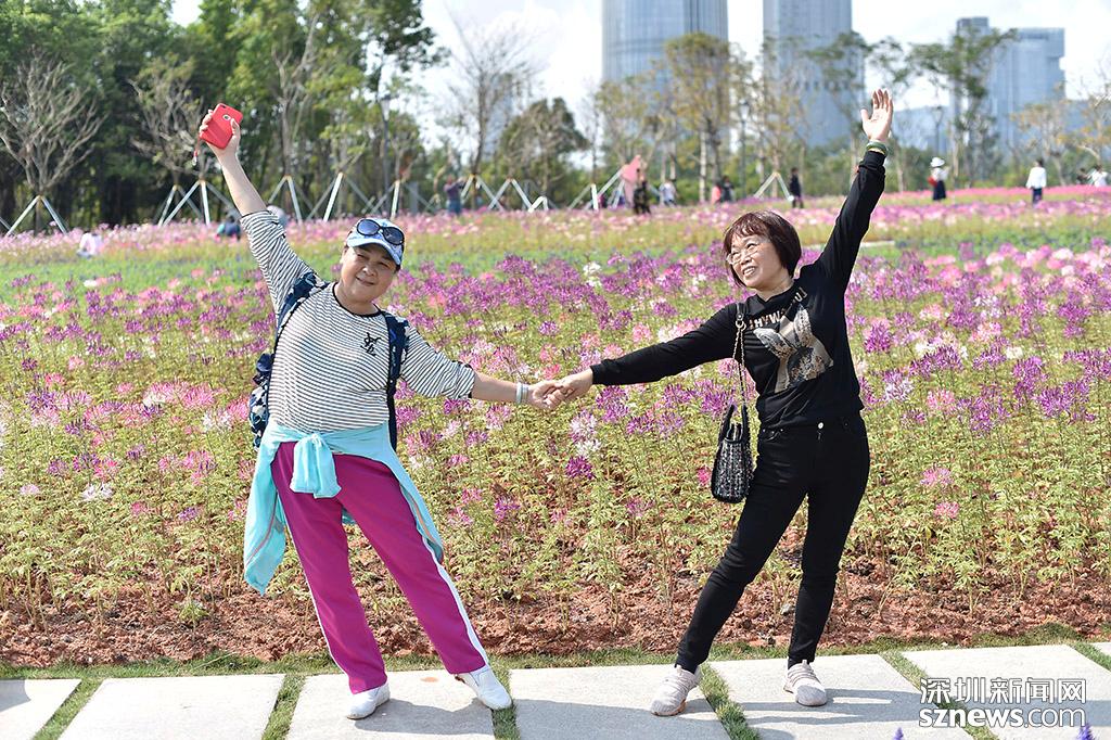 醉蝶花花海前,兩位市民擺出“Pose”合影