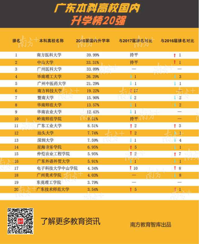 在發(fā)布“薪酬榜”后(點(diǎn)擊查看“薪酬榜”),今天南方教育智庫繼續(xù)獨(dú)家推出廣東高?!吧龑W(xué)榜”,梳理全省123所高校發(fā)布的《2018年畢業(yè)生就業(yè)質(zhì)量年度報(bào)告》的關(guān)鍵數(shù)據(jù),聚焦畢業(yè)生的深造路徑和升學(xué)比例。其中南方醫(yī)科大學(xué)、中山大學(xué)、廣州醫(yī)科大學(xué)本科畢業(yè)生國內(nèi)升學(xué)率位列前3名,均超過33%。