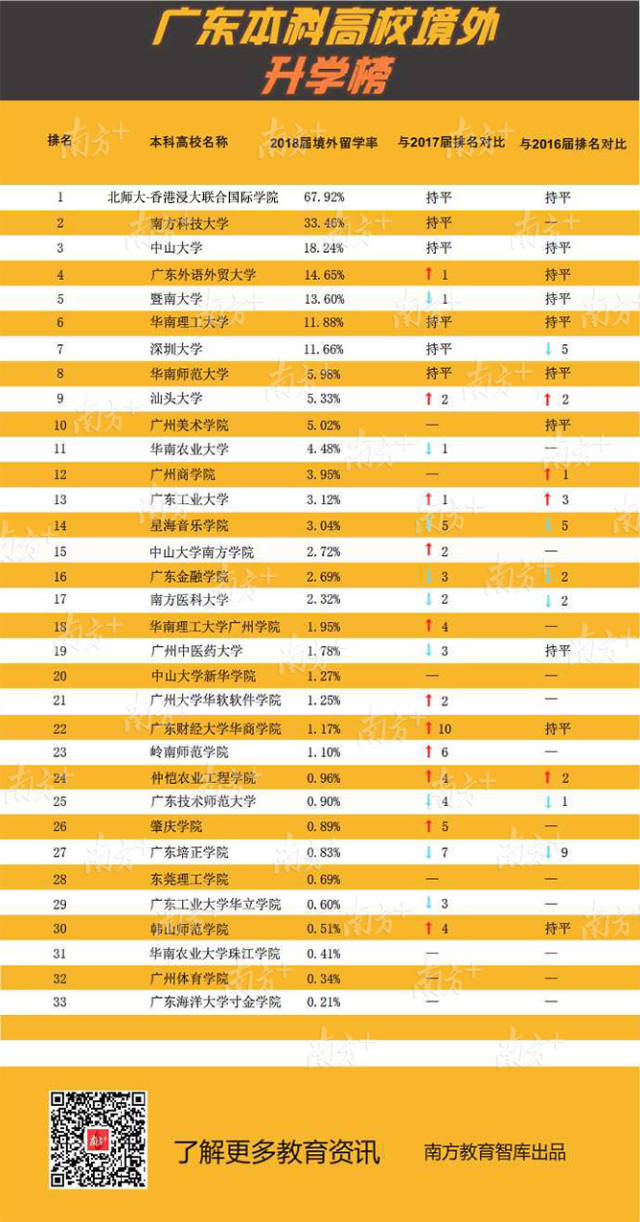 廣東外語外貿(mào)大學(xué)境外留學(xué)人數(shù)顯著提升,2018屆共有275人升入世界排名前100名的高校深造。兩所內(nèi)地與香港合作創(chuàng)辦的大學(xué)在境外留學(xué)率上處于全省前列。北京師范大學(xué)-香港浸會(huì)大學(xué)聯(lián)合國際學(xué)院持續(xù)多年保持全省第1位,此次共有811人留學(xué),其中481人就讀世界前100名的大學(xué)。香港中文大學(xué)(深圳)僅公布總升學(xué)率65.67%,該校就業(yè)處相關(guān)負(fù)責(zé)人介紹,升學(xué)率中絕大部分是境外留學(xué),176名學(xué)生平均每人收到3份世界知名大學(xué)錄取通知書。