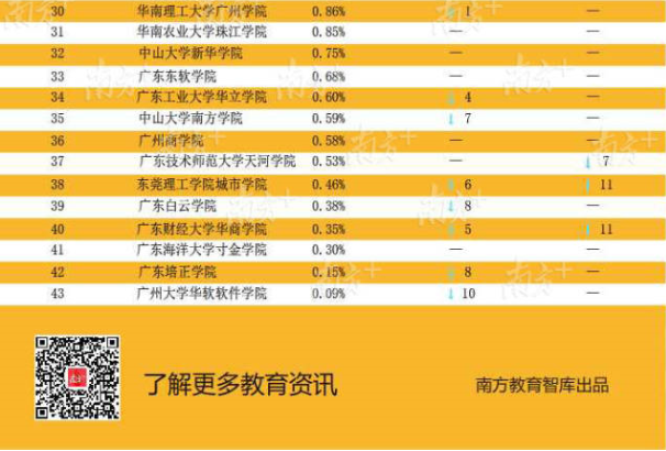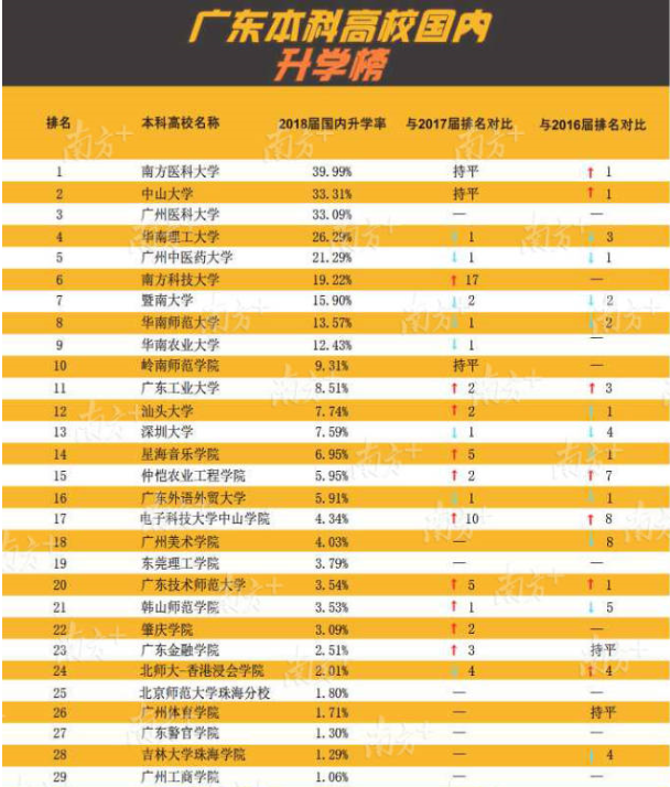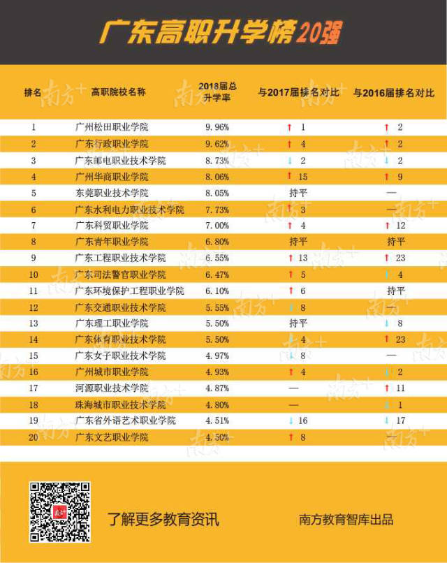 近3年各高職升學數(shù)據(jù)顯示,越來越多畢業(yè)生通過升學提升自身競爭力,尤其2018屆升學率增長明顯。其中有7所高職院校的畢業(yè)生升學率達到或超過7%,分別是廣州松田職業(yè)學院9.96%、廣東行政職業(yè)學院9.62%、廣東郵電職業(yè)技術學院8.73%、廣州華商職業(yè)學院8.06%、東莞職業(yè)技術學院8.05%、廣東水利電力職業(yè)技術學院7.73%和廣東科貿職業(yè)學院7.00%。