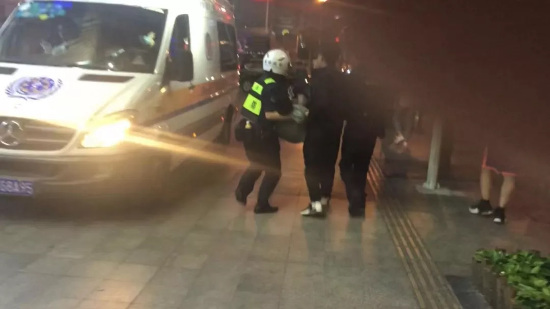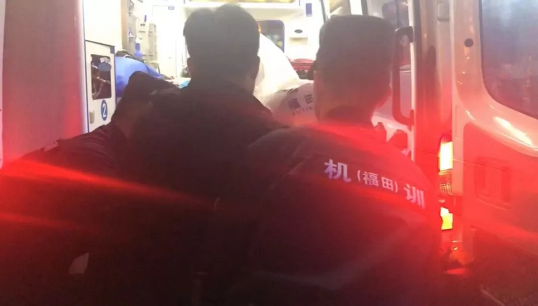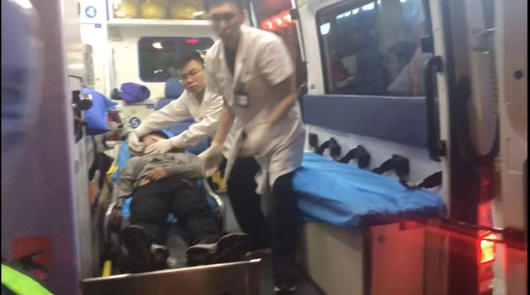救護(hù)車趕到現(xiàn)場(chǎng),隊(duì)員們爭(zhēng)分奪秒將男子抬上救護(hù)車。