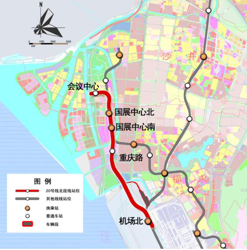 20號線北段起于寶安國際機場規(guī)劃 T4航站樓,在規(guī)劃 T4航站樓北側,11號線東側設機場北站,與11號線、穗莞深城際線換乘。之后線路往北沿展覽大道敷設,經(jīng)蠔業(yè)路后轉向北,于重慶路北側,展覽大道東側設重慶路站。線路繼續(xù)往北,沿新會展中心東側道路敷設,于景芳路南側設國展中心南站,與12號線換乘,在鳳塘大道路口設國展中心北站,與12號線、30號線換乘。線路自國展中心北站引出后,于和蕙路向東敷設,于海濱大道東側設會議中心站。線路全長約8.4km,采用地下敷設。
