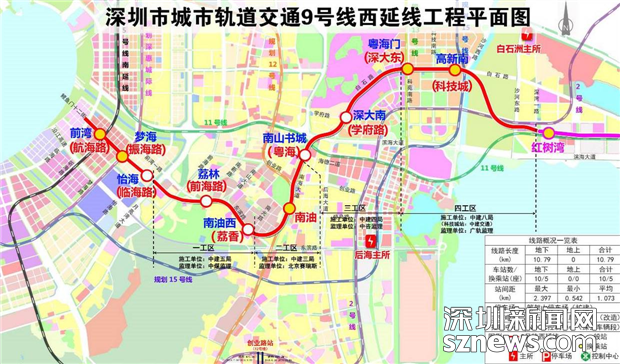 據(jù)了解,地鐵9號(hào)線西延線東起紅樹灣南站,經(jīng)深圳灣至前海灣,終點(diǎn)為前灣站,與5號(hào)線南延線換乘。線路全長(zhǎng)約10.8千米,設(shè)車站10座,全線采用地下敷設(shè)方式。