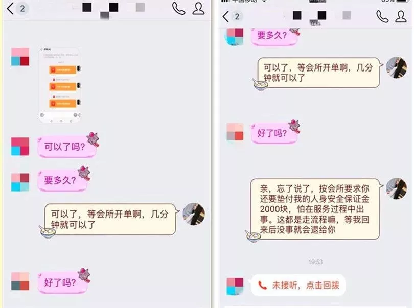 轉(zhuǎn)賬后,小李同學(xué)到一酒店開好房間,靜等“小妹”上門,但此時,對方要求再交1000元“風(fēng)險押金”才能安排“小妹”過來。