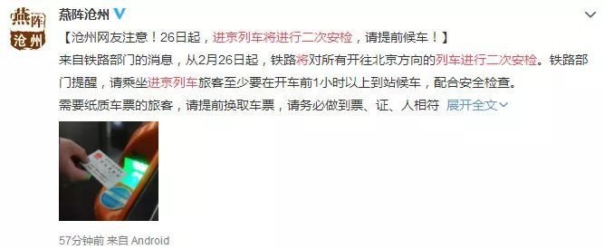 從2月26日起,鐵路將對所有開往北京方向的列車進(jìn)行二次安檢,即旅客在車站各進(jìn)站口安檢后還需要前往固定區(qū)域再進(jìn)行一次安檢。