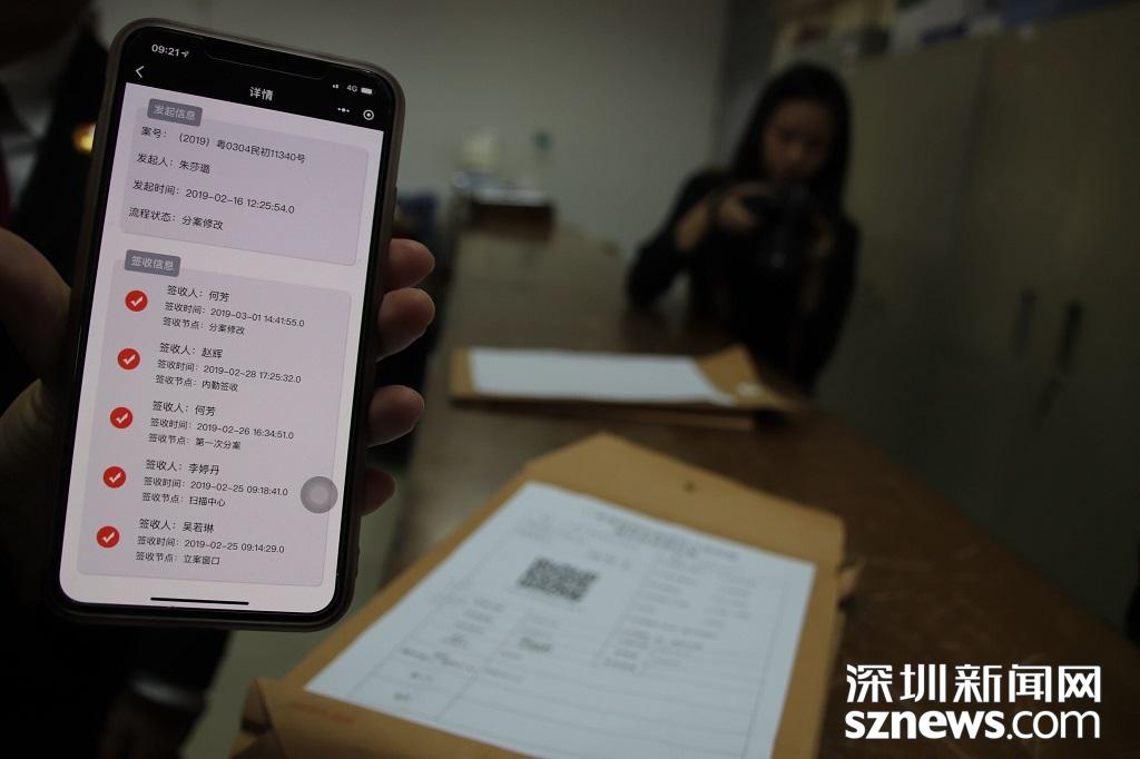 法官謝婷展示福田法院的流碼案件流轉(zhuǎn)系統(tǒng),該系統(tǒng)可節(jié)省80%的簽卷時(shí)間