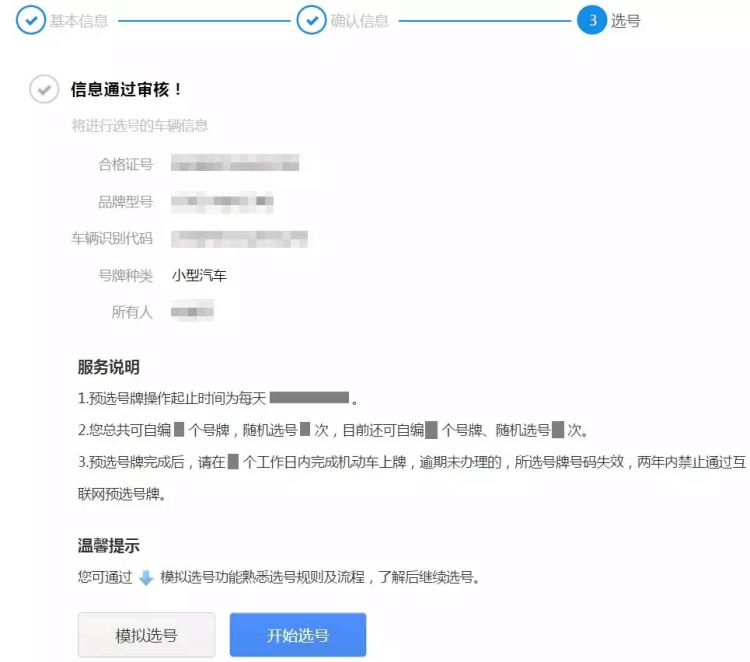 系統(tǒng)核查通過(guò)后會(huì)進(jìn)入選號(hào)服務(wù)說(shuō)明,用戶(hù)可以看到之前提交的信息,閱讀服務(wù)說(shuō)明后,點(diǎn)擊"開(kāi)始選號(hào)"按鈕開(kāi)始進(jìn)行選號(hào)操作。