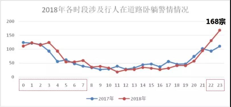 2018年接報涉及行人臥躺在道路警情中,最高峰值在夜間23時,共接報警情168宗,高發(fā)時段在22時至次日7時,共接報警情1032宗。