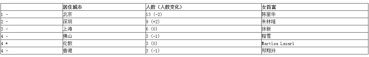 值得注意的是,上榜的女富豪居住城市中,前五名城市均來自中國,北京以13位上榜女富豪數(shù)位列第一。深圳、上海緊隨其后,各有9位、6位上榜女富豪居住,分別位列第二、第三。