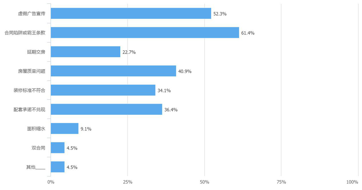 調(diào)查結(jié)果顯示,房產(chǎn)糾紛主要集中在購(gòu)買一手房、二手房和房屋裝修上,分別占比38.6%、27.3%、27.3%,而且將近70%的消費(fèi)者對(duì)房產(chǎn)交易過(guò)程中的相關(guān)知識(shí)和風(fēng)險(xiǎn)只是了解一般。同時(shí),消費(fèi)者在新建商品房和二手房交易過(guò)程中遇到的糾紛在問(wèn)卷結(jié)果中顯示都是多方面的。其中,新建商品房交易陷阱主要是“合同陷阱或霸王條款”、“虛假?gòu)V告宣傳”;二手房交易陷阱主要是“隱瞞房屋缺陷”。針對(duì)如何避免購(gòu)房糾紛,50%以上的消費(fèi)者認(rèn)為“購(gòu)房前咨詢朋友、專家”和“購(gòu)房前多學(xué)習(xí)房產(chǎn)知識(shí),防止受騙”是最好的辦法。