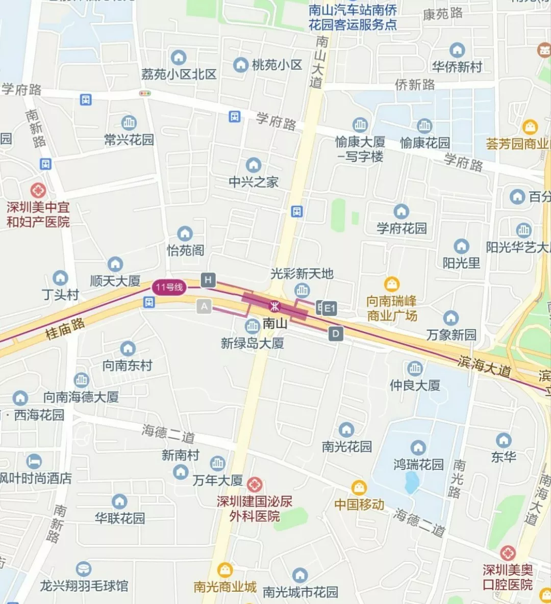南山站總共有5個(gè)出入口,A口位于南山大道南側(cè)、桂廟路西側(cè),需要乘車的市民請從D口、H口、E1口、E2口進(jìn)站乘車。