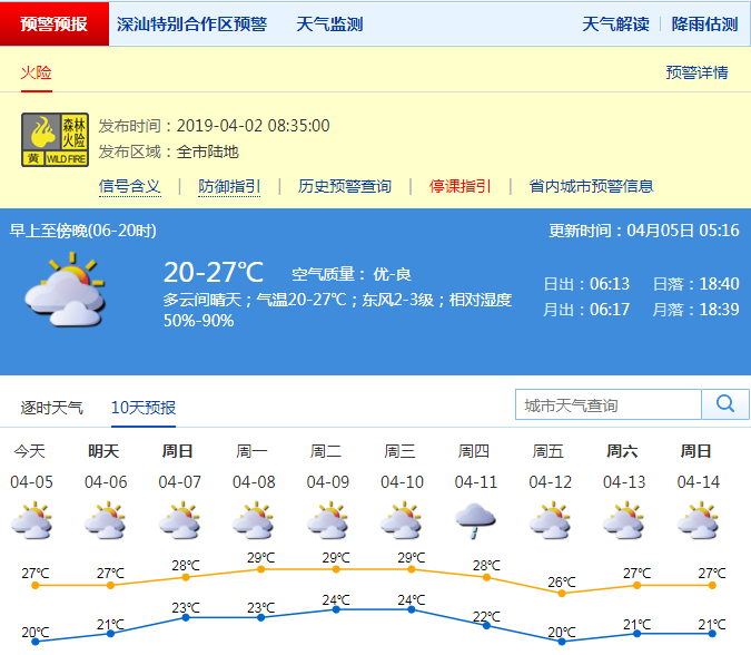 深圳新聞網(wǎng)2019年4月5日訊 深圳市氣象臺預計,清明假期(5-7日)我市多云可見陽光,溫暖干燥。其中,5日氣溫20℃-27℃,相對濕度50%-90%,東風2-3級;6-7日多云可見陽光;8-10日以多云為主,氣溫繼續(xù)上升,偶有分散陣雨。