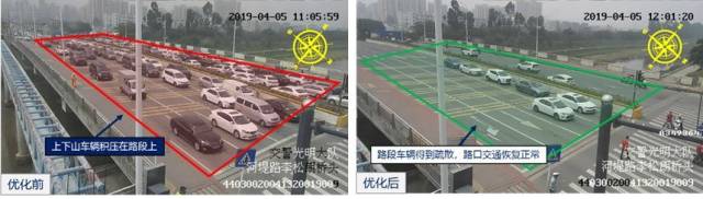 深圳交警立即使用臨時(shí)方案加大北面掉頭車輛放行時(shí)間,并啟用三條車道同時(shí)放行左轉(zhuǎn)與掉頭車輛,約15分鐘后路口排隊(duì)現(xiàn)象恢復(fù)正常。
