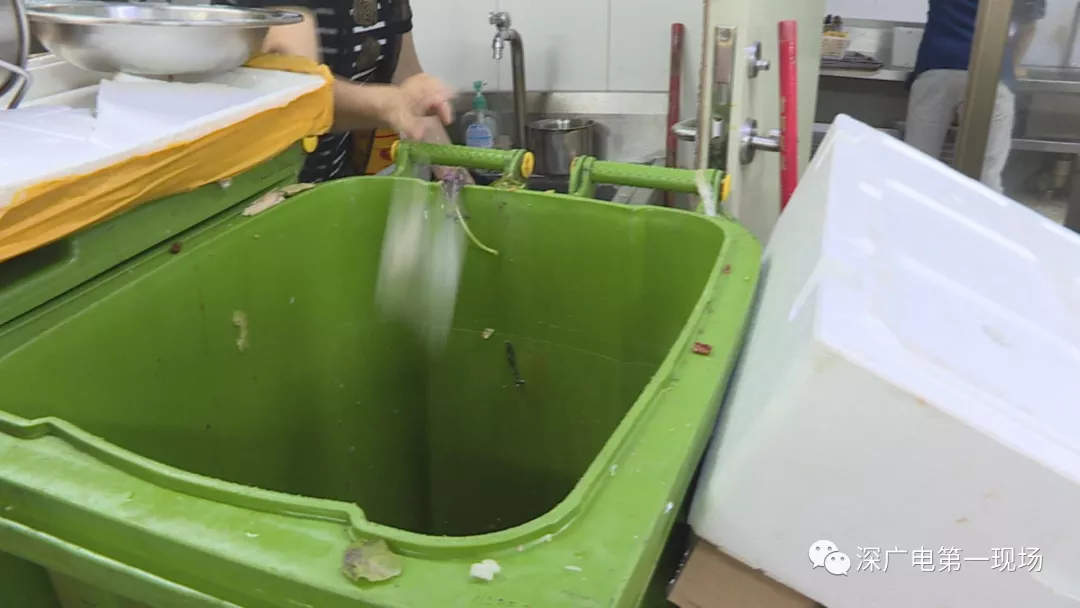 在接下來的檢查中,執(zhí)法人員發(fā)現(xiàn),后廚操作間的過道放置了幾個(gè)大垃圾桶,裝滿了餐廚垃圾卻沒有加蓋。