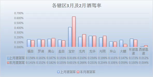 按轄區(qū)進(jìn)行劃分:3月酒駕率最高為寶安0.631%,其次是龍崗0.266%、光明0.234%。