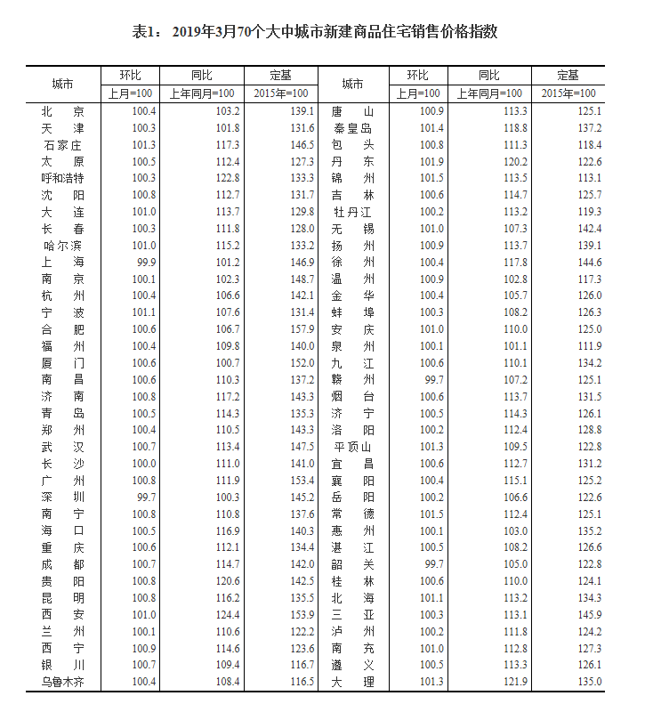 2019年3月份70個大中城市商品住宅銷售價格變動情況