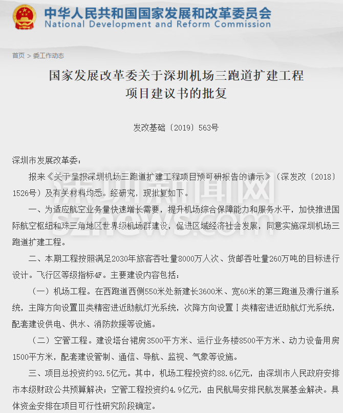 國(guó)家發(fā)展改革委關(guān)于深圳機(jī)場(chǎng)三跑道擴(kuò)建工程項(xiàng)目建議書的批復(fù)截圖