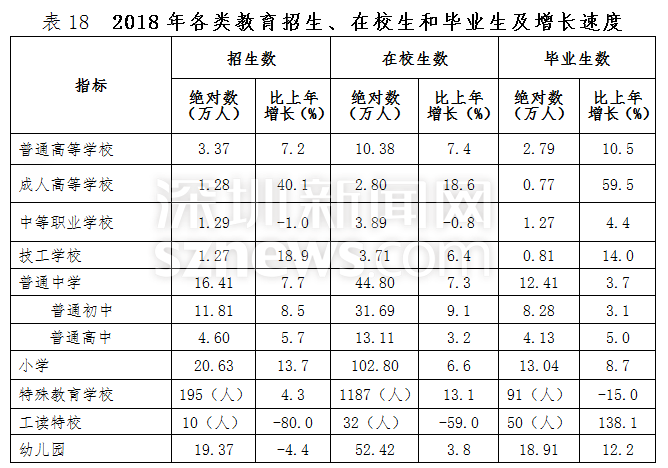 年末全市各級各類學(xué)??倲?shù)達(dá)2551所,比上年增加114所;畢業(yè)生50.02萬人,招生63.63萬人,在校學(xué)生220.92萬人,分別增長9.3%、5.9%和6.1%。年末全市有幼兒園1771所,增加88所;在園幼兒52.42萬人,增長3.8%。有小學(xué)344所,增加2所;在校學(xué)生102.80萬人,增長6.6%。有普通中學(xué)390所,增加22所;在校學(xué)生44.80萬人,增長7.3%。有普通高等學(xué)校13所,增加1所;在校學(xué)生10.38萬人,增長7.4%。